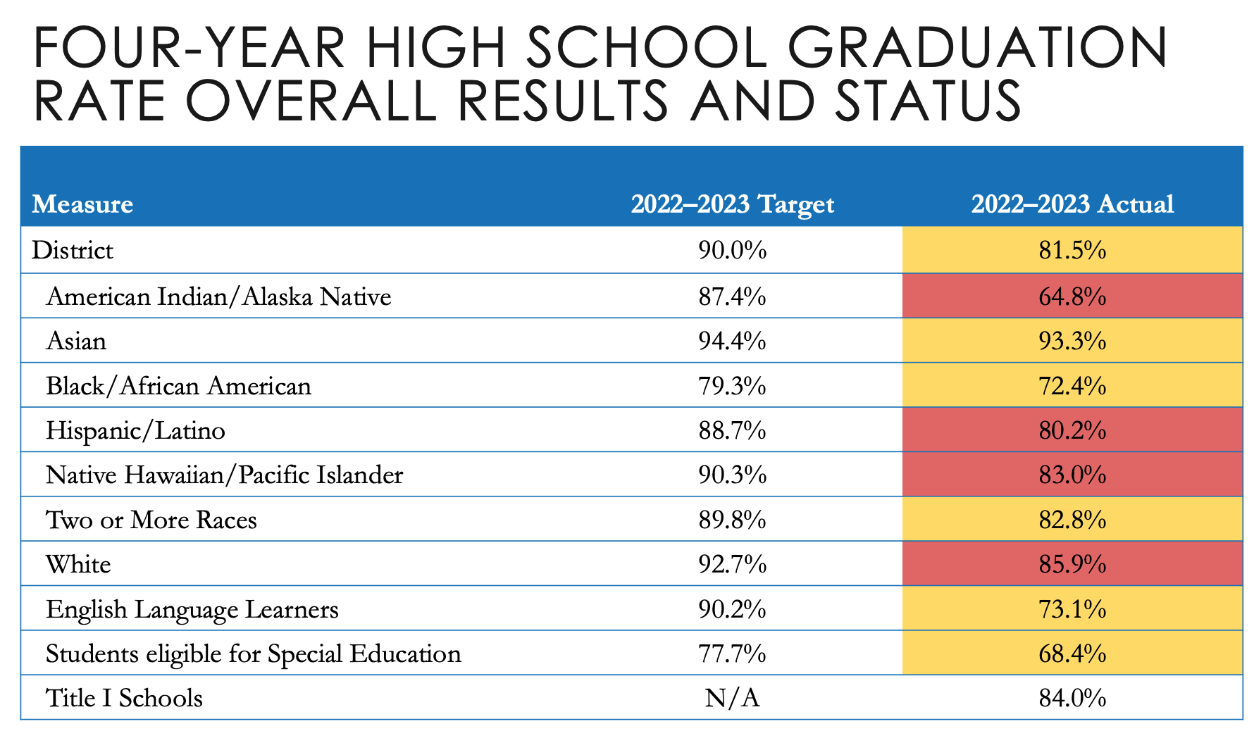 District-wide four-year graduation rates for the 2022-23 school year were 81.5%, against a target of 90%. Specific student population graduation rates are detailed in the chart below: