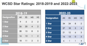 This is the first post-pandemic year that star ratings have been reported (the last year was 2018-19). Overall, the number of one and two-star schools rose, while the number of five-star schools decreased. The number of three-star schools rose, and the number of four-star schools stayed the same. The comparison of star rating designations between 2018-19 and 2022-23 can be found in the chart below: